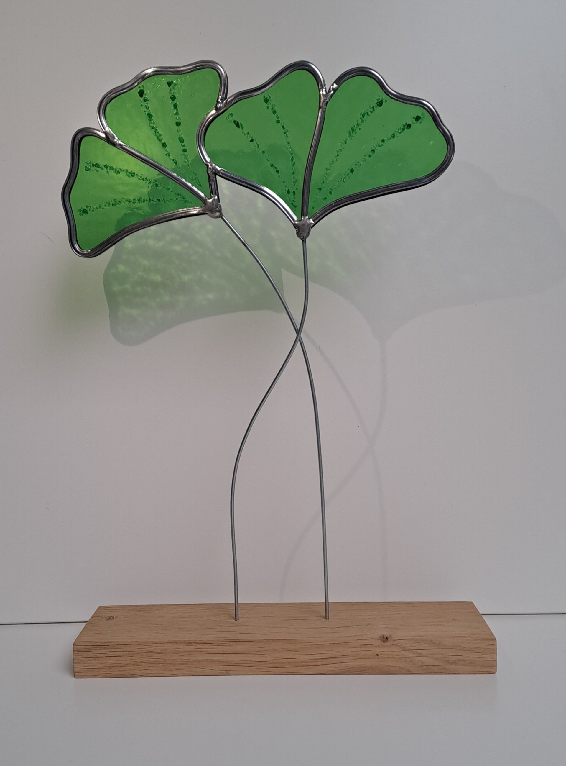 De Ginkgobladeren zijn + 21x10cm groot. De eikenhouten voet is 22x6 en 2 cm hoog. De totale hoogte van dit werk is + 32 cm.
