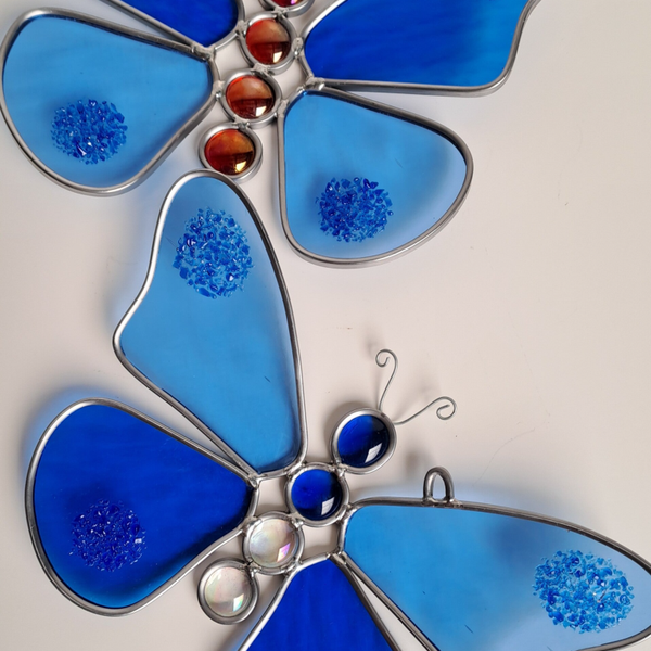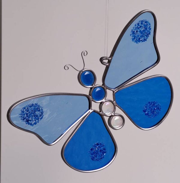Vlinder met 2 tinten blauwe vleugels 3D, + 20x16 cm, verrassend, er zijn glaskorrels gesmolten op de vleugels (fuse techniek)!