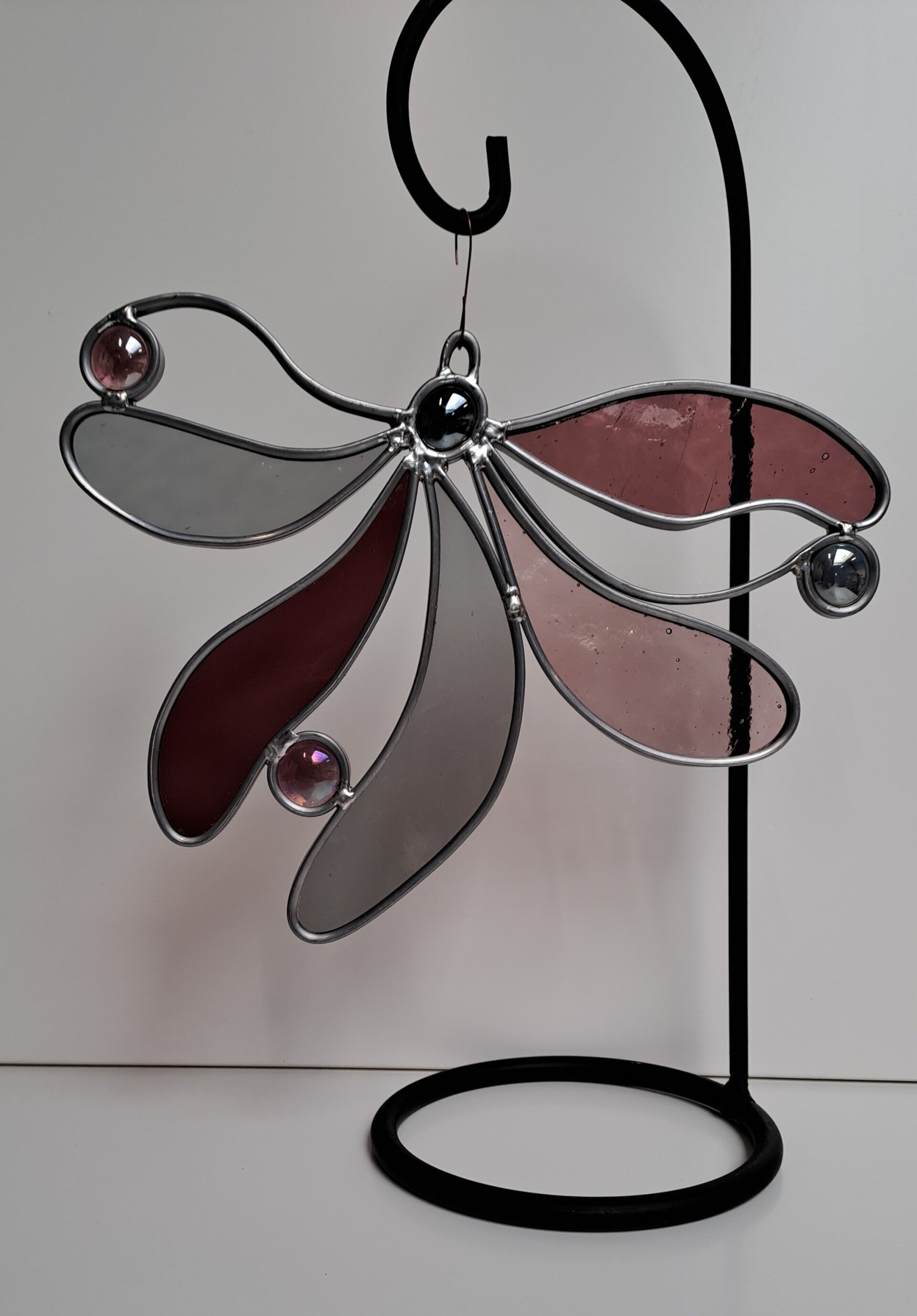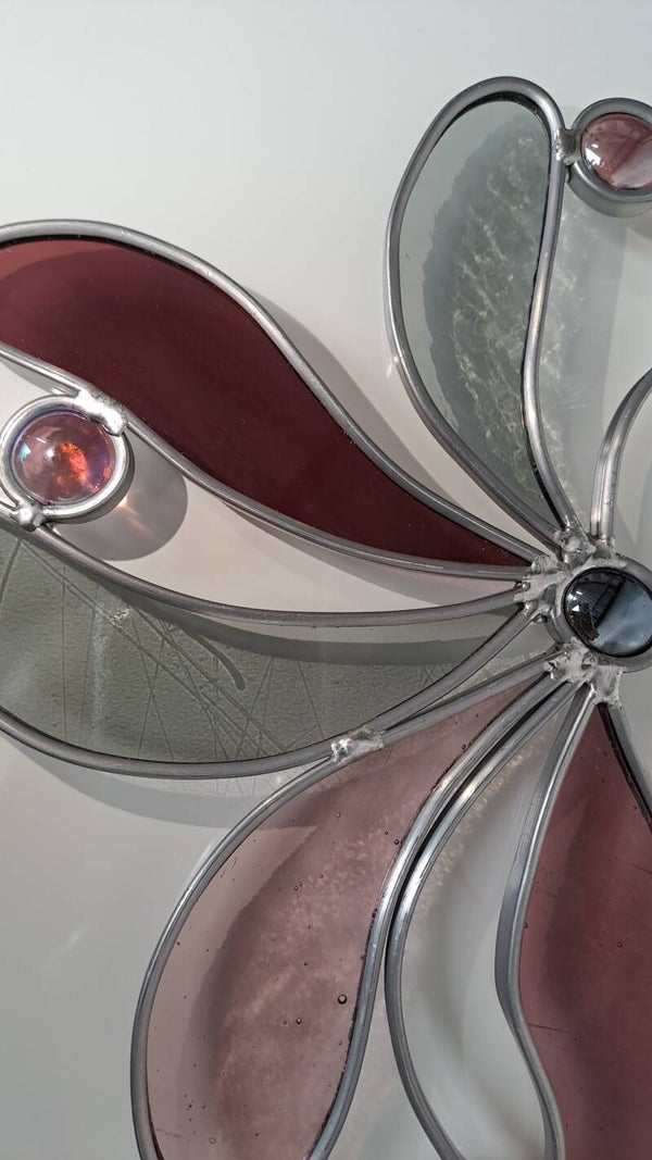 Raamhanger in oud roze en grijs tinten. Asymmetrisch met glasnuggets. Grootte ± 20x20cm.