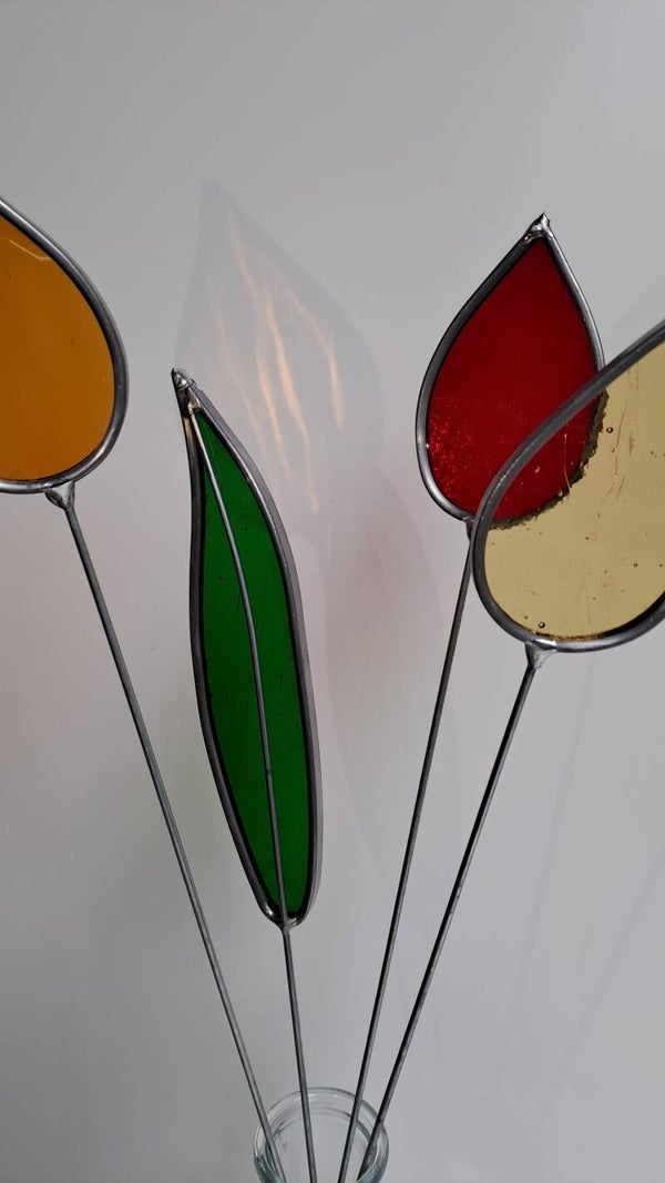 Boeket tulpen, set bestaande uit 3 tulpen en 1 blad. In rood, amber, geel tinten. Exclusief vaasje.
